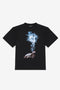 Long sleeve French terry hoodie in black. Graphic print at front and back. Elasticized cuffs and waist. Visible, raw stitching.